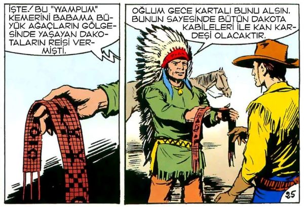 Tex, kayınpederi Kırmızı Ok‘tan Dakota Wampum‘u alır ve bu sayede tüm Dakota kabileleriyle kan kardeşi olur ve Kanada’ya doğru yola çıkar. Wampum, barış ve tanınmanın bir işareti olarak, Tex tarafından gelecekte Kızılderililerle karşılaştığında sıklıkla kullanılacak ve biz Tex okurlarının iyi bildiği bir simge olacak.