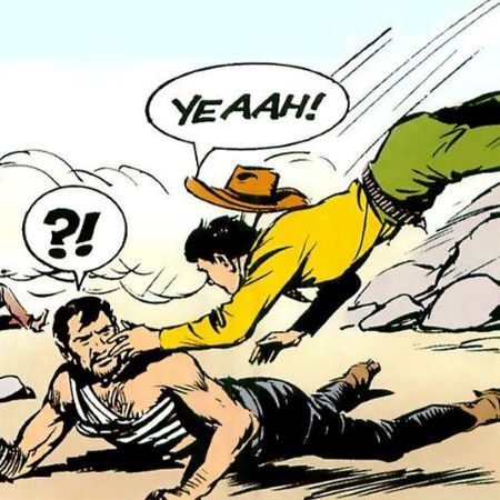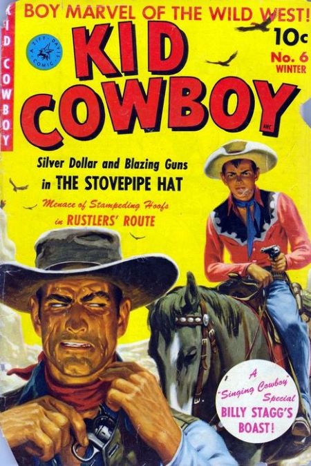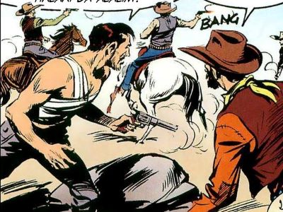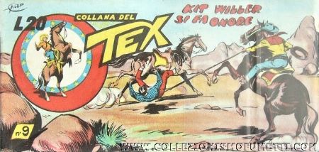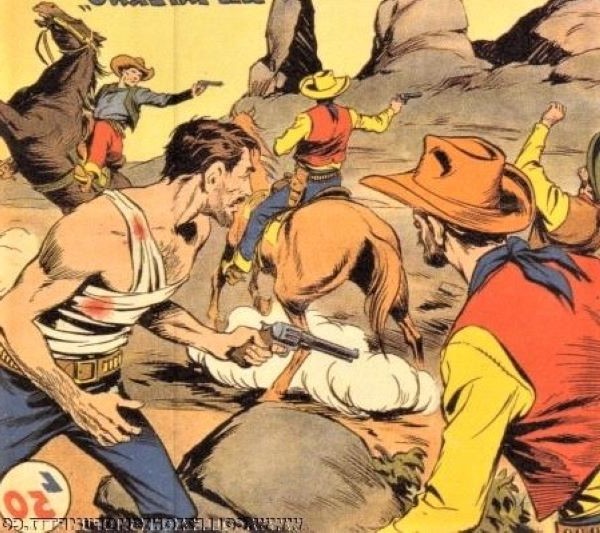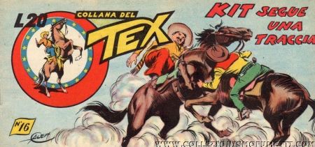 Yine hikayeli bir kapak daha. Çocuk Kahramanlar ABD’de de ÇizgiRomanların baş kahramanlarıydı. Vahşi Batı’nın kahraman çocuğu Kid Cowboy, 1951 kışında çıkan macerasının altıncı sayısının kapağında bu şekilde yer almıştı. Kid Cowboy karakterini Alex Blum çiziyordu. Benzerliğe dikkat! Bu resim önce 1954 yılında, 2. Onur serisinin 3. sayı kapağında, sonra da 1962 yılında, haydutun silahı yok edilerek, Kit‘in yerine Tex monte edilerek ve de haydut ile atın birbirinden biraz uzaklaştırılmasıyla yeniden kullanıldı. Bu grafik dönüşümü ve uygulamayı Franco Bignotti‘nin yaptığını söylemeye gerek var mı, bilmiyorum? Gerçi; 1987 baskısı olan, Tutto Tex serisinde tabanca haydudun eline yeniden oturuyor. Ülkemizde, Maceraperest Çizgiler tarafından basılan kitap Tutto serisi içinde olduğu için tabanca mevcut. Ayrıca bazı ufak tefek; tepe, gömlek ve kontürler gibi önemsiz değişiklikler de yapılmış.