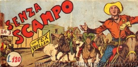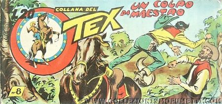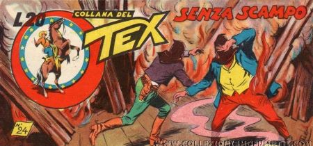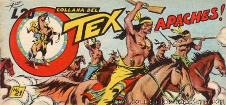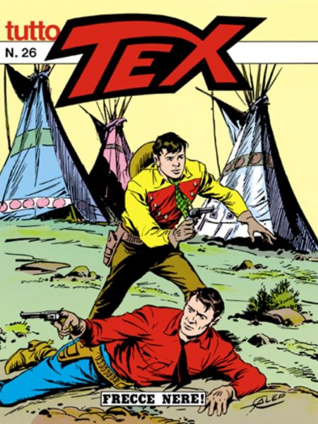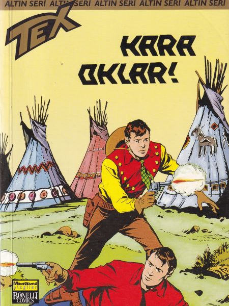 1954 yılında çıkan, 2. Onur serisinin 7. sayı kapağı, adet olduğu üzere imzasız. Bu güzel kapak; İlk olarak, şu an incelediğimiz aylık serinin, 1962 yılında çıkan, 26. sayısının kapağında kullanıldı. Ama, arka planı tamamen değiştirildi. Yine baş rolde Franco Bignotti. Bignotti; ismin içinden Kara Oklar geçirmiş. Arkaya; kızılderili çadırları, sarı gökyüzü koymuş, Kit Willer‘e yeşil gömlek giydirmiş ve Tex logosunu küçültmüş. Ama, enteresan olan, 1988’de çıkan, Tutto Tex serisi baskısında çadırlar yaklaşmış, renkleri toparlanmış ve tabancalar susmuş. Ülkemizde Maceraperest Çizgilerden çıkan kapak, Tex Nuova Ristampa serisinde kullanılan kapak.