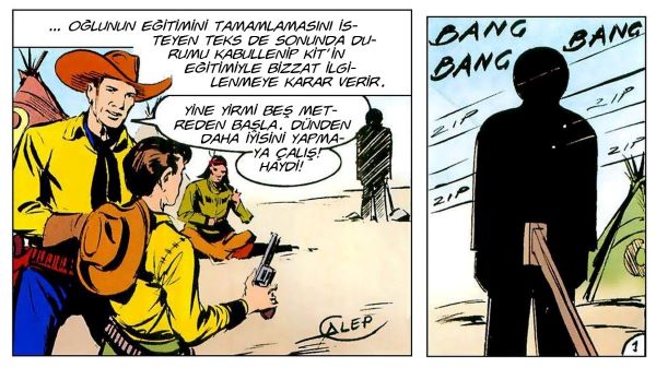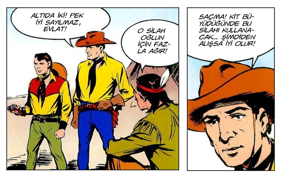 Öykü güzel bir açılış sahnesiyle başlıyor. Silah kullanmanın püf noktalarını babasından öğrenen Kit, hata yaptığında da babasından uyarıları alıyor. Bu arada dersler çok gerçekçi. G.L.Bonelli silah kullanmayı bildiğini de gösteriyor bize. Ama, Tex’in aksine Kit eldivensiz. Ve Kit elinde silahlarla hemen bir star oluyor. Belli ki Bonelli, vakit kaybetmeden yardımcı karakteri oyuna sokmak istemiş.