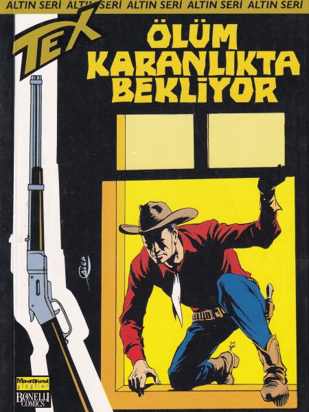 Pecos City’de Dram macerasının içindeki bir vinyet, önce 2. Onur serisinin 11. sayı kapağı olarak kullanıldı. Vinyete, Hakim Vermont elinde silahla ilave edildi ama Hakim Vermont macerada eline hiç silah almamıştı. 1963 yılında ise, Aylık serinin 32. sayısı olan Ölüm Karanlıkta Bekliyor kitabının kapağında, bir tüfek ilave edilerek yeniden kullanıldı. Fakat dikkat edilirse; pencereli vinyette, Tex’in iki elinde de eldiven var! Ama Tex’in iki kapaktaki sağ eli de eldivensiz!