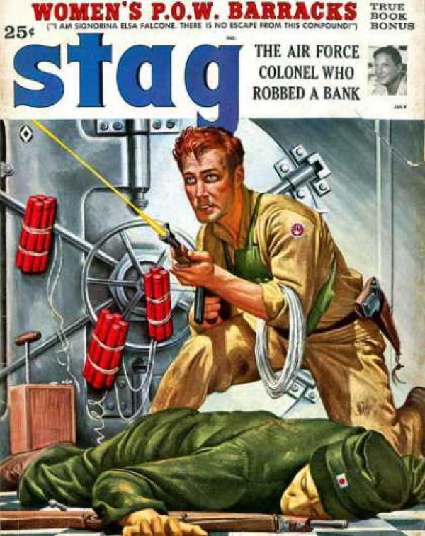 Ama Galep usta, Tex’in bu kapak pozunu hazırlarken, başka bir görselden çok etkilenmiş. dimeweb.blogspot.com‘un usta kapak dedektifleri Bosco ve Scremin‘in araştırmalarına göre, Temmuz 1959 tarihli Amerikan erkek dergisi Stag başrolde. Konusu, ABD/Kore arasında geçen casusluk öyküsü. Görsel, Mort Kunstler tarafından çizilmiş. Morton Künstler (1927-2025), özellikle Amerikan İç Savaşı olmak üzere tarihi olayların ve savaşların resimleriyle tanınan bir Amerikalı sanatçıydı ve kendisini bu yılın şubat ayında kaybettik. Görselin modeli olarak da Steve Holland‘ı kullanmıştı. Steve Holland (1924-1997) 1954’te yayınlanan Flash Gordon dizisinde Flash Gordon‘ı da canlandırmış, 1950’li, 60’lı yıllarda Amerikan ucuz roman kapaklarının önemli figürlerinden biriydi.