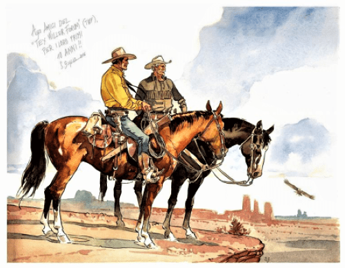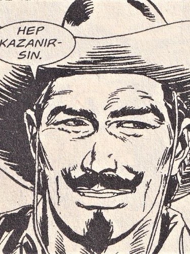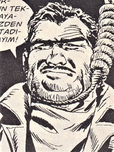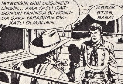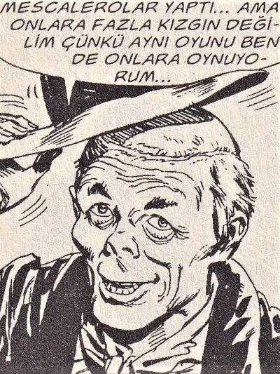 Öykünün 9. kitabının 103. sayfasında ise Western meraklılarına bir test yapmış Marcello. Soru basit. Bu sahne, hangi meşhur filime gönderme yapıyor? Tabii ki İyi, Kötü ve Çirkin. Sergio Leone‘nin o meşhur filmindeki 23. dakika. Clint Eastwood‘un, Eli Wallach‘ı idamdan kurtarmak için ipe ateş etme sahnesini Tex, Kit’i kurtarmak için tekrar eder. Ustaya Saygı.