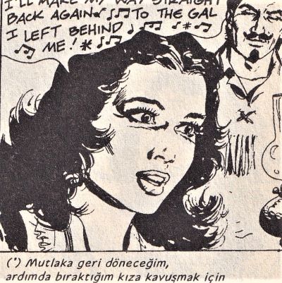Lena, 9. kitabın 9. sayfasında Carson’un istediği bir şarkıyı söyler. ‘Ardımda Bıraktığım Kıza!’. Hatta, Carson da eşlik eder şarkıya. Ama pek beceremez herhalde ki Lena, ”Şarkı söylemek için doğmadığın belli Kit Carson” der. Bu şarkı, öykü boyunca üç kitapta da konu edilir. Öykünün sembol şarkısıdır. Şarkının You Tube Link’ini de en altta bulacaksınız. (Şarkıda ingilizce ‘Gal’ kelimesi ‘Girl anlamındadır. Yani ‘kız’).