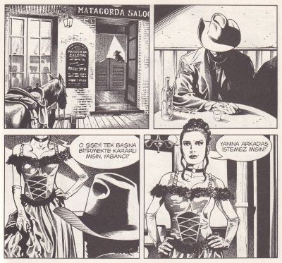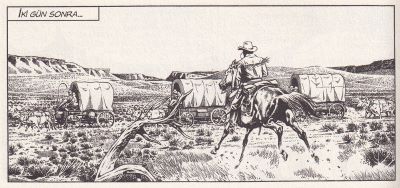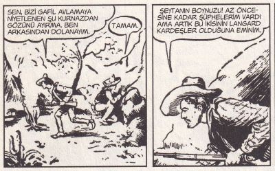 Özellik: Öykümüzün eski bir Kit Carson hikayesi ile başladığını söylemiş idik. Burada bahsettiğimiz öykünün geçtiği tarih değil. Öykünün çizim tarihi. İlk öykü 1949 yılı Galeppini çizimi ve Rahmetli G.L. Bonellinin yazdığı bir hikaye. Cactus City’de Düello. Asıl öyküye giriş olarak konmuş 11 sayfalık kısa bir öykü. Benim aklıma bu acaba yakın zamanda çizilmiş bir öykümü diye bir şüphe düştü. Çünkü Maceraperest Altın seride olmayan bir hikaye bu. Şunu biliyoruz ki İtalya’da, 1958 yılında başlayan seride bazı öyküler yer almadı. Ama 1950’li yıllarda Türkiye de basılanlarda varmı? Bilmiyorum; onları görme şansım hiç olmadı. Ama, yine de, Galep’in çizimleri olduğundan emin oldum. Şapkaların perspektif’i ile bu kadar problemi olan Galep’ten başka çizer görmedim. 🙂