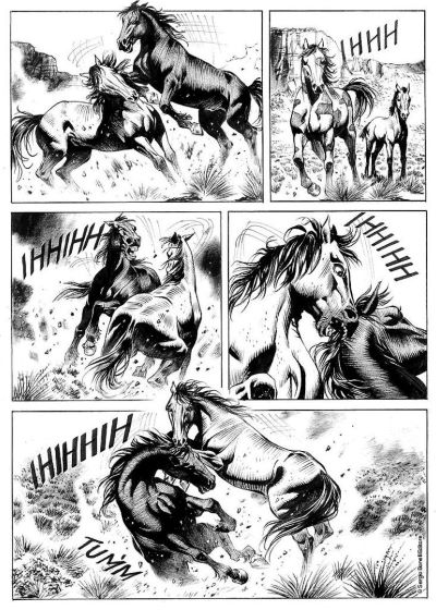 Dotti, sürüdeki atların yaşamını anlatan, hareketli vücutlarının ana hatlarının çizildiği ve büyük bir dinamizmi gösteren sahneler yaratmış. Hayvanların kasları ve hareketleri oldukça inandırıcı bir şekilde çizilmiş, hatta arka planlar ve manzaralar bile büyük bir özenle yaratılmış. Dotti ayrıca, gerilimi vurgulayabilen dokuza bölünmüş bir sayfa ile son sekans’da gerginliği tavana çıkartıyor.