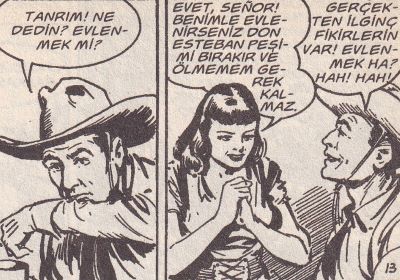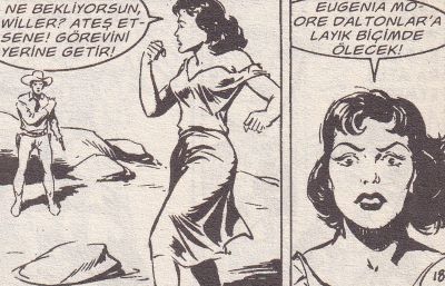 Karşısındaki femme fatale ise istasyon görevlisinin yeğeni güzel Eugenia’dır ve Daltonların yardakçısıdır. Eugenia’nın hangi Dalton’un sevgilisi olduğunu söylemek zordur, ama bir karede Bob Dalton’un atında neredeyse onun kucağında oturuyordur ve sıyrılmış eteğinden baldırları görünür. Bu macerada Daltonlar Teks ve Tiger’i boğazlarına kadar toprağa gömerler. Onları kurtaran ise kahramanımızın atı Dinamit’tir. Üstelik savunmasız kalmış Teks ve Tiger’a yaklaşan bir yılanı ezer, toprağı eşeleyerek sahibini kurtarır. Toynaklarıyla toprağı daha doğrusu kumu eşeleyen Dinamit onu beline kadar serbest bırakmıştır. Kalan kısmı elleri bağlı Teks kendisi halleder ve çukurdan çıkar. Hâlâ toprakta gömülü Tiger’a ellerini uzatır, kızılderili ipleri kemirir ve rangerin elleri serbest kalır. O da Tiger’i topraktan çıkarır. İnanılmaz değil mi? Maceranın sonunda Eugenia Teks’e rahatça ateş edebilecek durumdayken bunu yapmaz. “Ben insan öldüremem,” der. Tabii bizim yufka yürekli esas oğlanımız da suçlu bile olsa bir kadına ateş edemeyecektir. Onu serbest bırakır. Lakin psikolojisi bozulmuş olan Eugenia kendini uçurumdan aşağı atacaktır. Olayın gidişatında diğer ilginç bir özellik son çatışmada Teks’in vurulduğu net bir kare olmamasına karşın Eugenia’nın ona silahı doğrultuktan sonra kahramanımızın omuzunu tutmasıdır. Halbuki Teks en son Dalton kardeşlerden Emmett’i hakladığında bile omuzundan vurulduğuna dair bir kare yoktur. Eugenia da ona ateş etmediğine göre Teks’in sol omuzunda deliği açan kimdir? Muamma olarak kalmıştır. Diğer muamma Eugenia’nın hangi Dalton’un sevgilisi olduğudur. Avarel olmadığı kesin tabii. Zaten Avarel, Red Kit’de vardı ve orijinal öyküde böyle bir Dalton yoktu. Gelecek ay yine görüşelim arkadaşlar.
